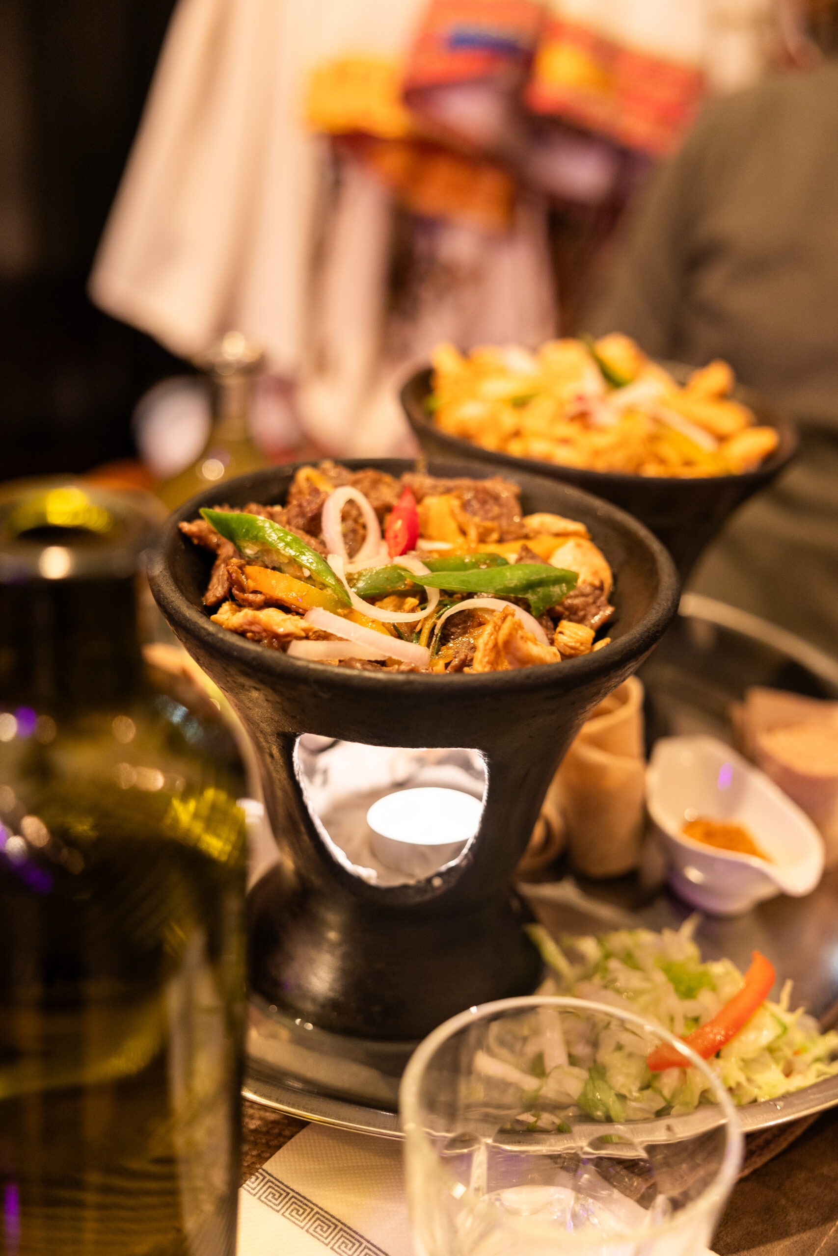 Filets de poulet marinés et lanières de boeuf marinées, grillées au piment vert, échalotes et herbes, accompagnées d’injera.